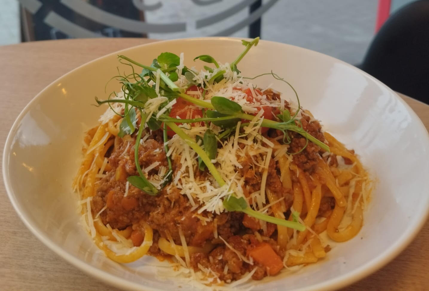 Linguine with slow-cooked beef ragù, herbs, cherry tomatoes, parmesan.