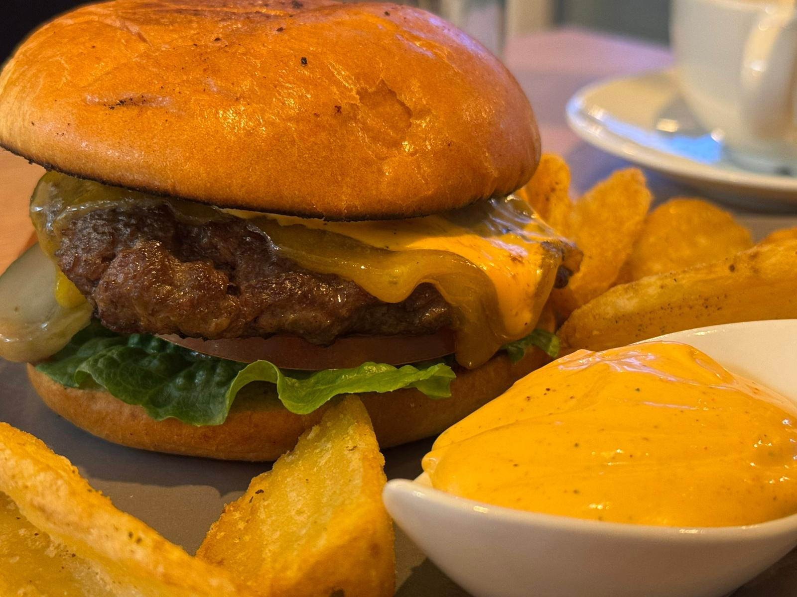 Beef patty, pickles, lettuce, tomato, red onion, cheddar, mayo.
