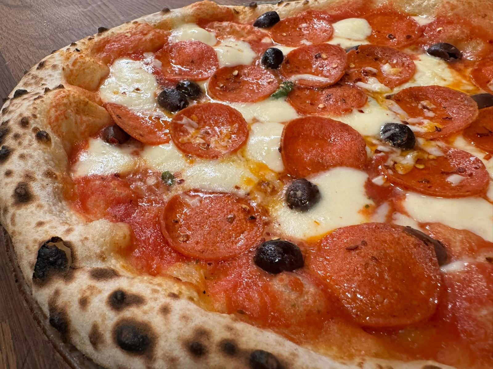 Tomato sauce, fior di latte, basil, pepperoni, olives, parmesan, chili flakes.